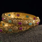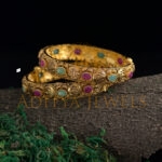 Nakshi Bangles 916 (22kt) Classic Nakshi bangles in 916 (22kt) gold, featuring Ruby (RU) and Emerald (EM) stones with a striking black antique finish. Size 2.5 perfect for traditional elegance.