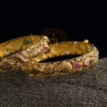 Intricately designed Nakshi bangles in 916 (22kt) gold, embellished with Ruby (RU), Emerald (EM), and Cubic Zirconia (CZ) stones. Finished with a striking black antique touch. Size 2.5 perfect for timeless traditional style.