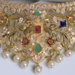 Traditional Pachiwork choker crafted in 916 (22kt) gold, featuring vibrant Navratan stones and finished with a rich black antique polish. Length: 8″ a colorful and timeless piece for special occasions.