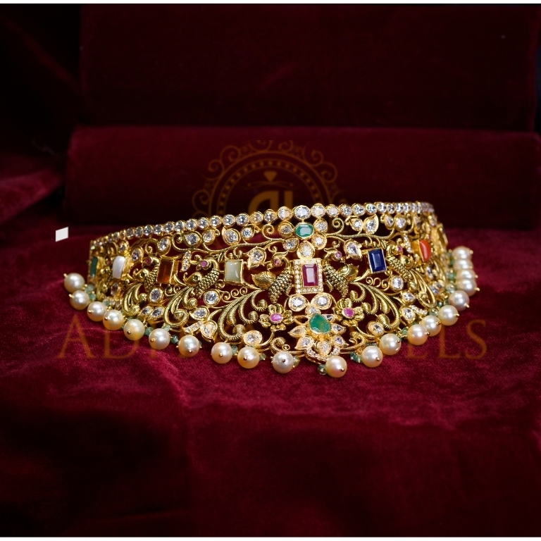 An opulent 916 (22 kt) gold choker showcasing sparkling CZ stones, vivid rubies, lush emeralds, luminous pearls, sacred Navratna gems and intricate bead detailing ideal for statement occasions.
