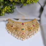 Beautifully handcrafted in 916 (22kt) gold, this Pachiwork choker features a rich blend of Ruby (RU), Emerald (EM), Cubic Zirconia (CZ), and Pearl (PRL) stones. Accentuated with a striking black antique finish. Length: 8″ perfect for traditional and festive wear.