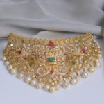Beautifully handcrafted in 916 (22kt) gold, this Pachiwork choker features a rich blend of Ruby (RU), Emerald (EM), Cubic Zirconia (CZ), and Pearl (PRL) stones. Accentuated with a striking black antique finish. Length: 8″ perfect for traditional and festive wear.