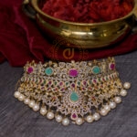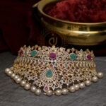 Beautifully handcrafted in 916 (22kt) gold, this Pachiwork piece features a striking combination of Ruby (RU), Emerald (EM), Cubic Zirconia (CZ), and Pearl (PRL) stones. Accentuated with a rich black antique finish. Length: 8″ a timeless design perfect for traditional elegance.