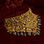 Intricately crafted Nakshi choker in 916 (22kt) gold, featuring a rich mix of Ruby (RU), Emerald (EM), Cubic Zirconia (CZ), Pearls (PRL), and decorative beads. Finished with a bold black antique polish. Length: 8″ a perfect fusion of traditional charm and timeless elegance.