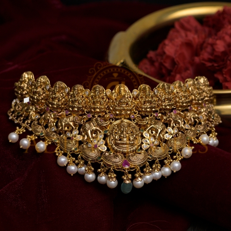 Beautifully handcrafted Nakshi choker in 916 (22kt) gold, embellished with Ruby (RU), Emerald (EM), Cubic Zirconia (CZ), and Pearl (PRL) stones. Finished with a rich black antique polish. Length: 8″ perfect for a classic and regal traditional look.