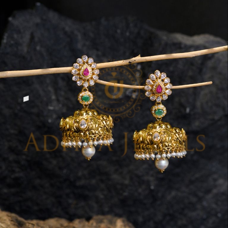 Crafted in 916 (22kt) gold, these earrings are embellished with CZ, ruby (RU), emerald (EM), pearls (Prl), and beads.