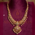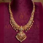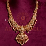 Exquisite Pachiwork long necklace crafted in 916 (22kt) gold, adorned with Ruby (RU), Emerald (EM), Cubic Zirconia (CZ), and Pearl (PRL) stones. Finished in a classic gold tone. Length: 18″ perfect for a graceful and regal traditional look.