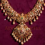 Exquisite Pachiwork long necklace crafted in 916 (22kt) gold, adorned with Ruby (RU), Emerald (EM), Cubic Zirconia (CZ), and Pearl (PRL) stones. Finished in a classic gold tone. Length: 18″ perfect for a graceful and regal traditional look.