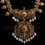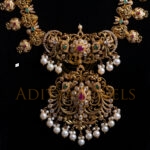 Beautifully handcrafted in 916 (22kt) gold, this Pachiwork long necklace features an elegant combination of Ruby (RU), Emerald (EM), Cubic Zirconia (CZ), and Pearl (PRL) stones. Finished in a radiant gold tone. Length: 18″ perfect for traditional occasions and festive celebrations.