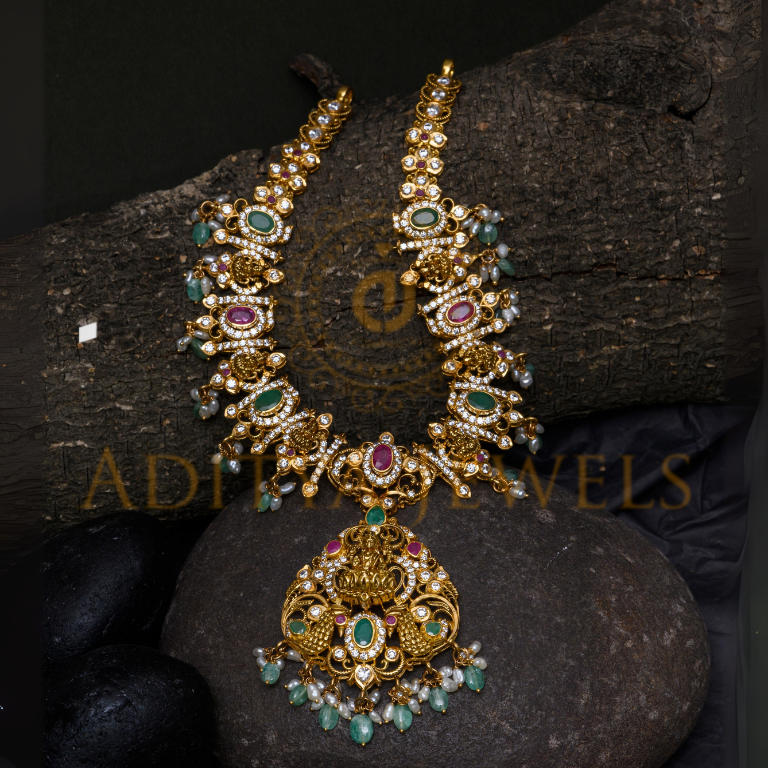 This beautifully crafted 9″ short necklace in 22kt (916) gold is adorned with CZ, emerald, pearls, and delicate bead accents, offering a graceful and traditional appeal.