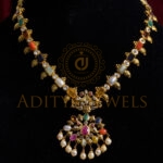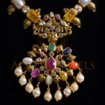 Expertly handcrafted in 916 (22kt) gold, this Pachiwork long necklace features vibrant Navratan stones, symbolizing balance and beauty. Finished in a radiant gold tone. Length: 9″ a colorful and timeless piece perfect for festive and traditional occasions.