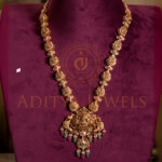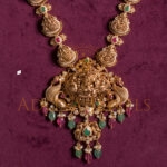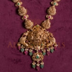 Intricately designed Pachiwork long necklace in 916 (22kt) gold, featuring a beautiful blend of Ruby (RU), Emerald (EM), Cubic Zirconia (CZ), Pearls (PRL), and decorative beads. Enhanced with a rich black antique finish. Length: 18″ a perfect piece for a grand and graceful traditional look.