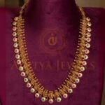 Intricately crafted in 916 (22kt) gold, this Pachiwork long necklace showcases a stunning blend of Ruby (RU), Emerald (EM), and Cubic Zirconia (CZ) stones. Enhanced with a bold black antique finish. Length: 20″ perfect for a majestic and traditional statement look.