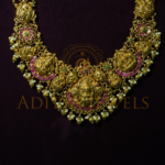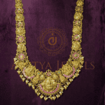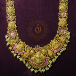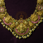 Traditional Temple-style long haram crafted in 22K (916) gold with ruby, emerald, and pearl work. Length: 16