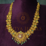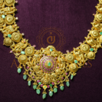 Traditional Nakshi-style haram crafted in 22K (916) gold with ruby, emerald, pearl, and bead work. Length: 16