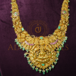 Elegant 22K (916) Temple-style long haram featuring ruby, emerald, and pearl detailing. Size: 16