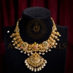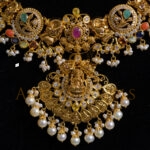Pachiwork Short Necklace 916 (22kt) Traditional Pachiwork short necklace in 916 (22kt) gold, beautifully embellished with vibrant Navratan stones. Finished with a bold black antique polish. Length: 9″ perfect for festive and ethnic wear.