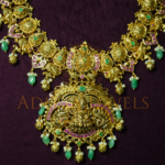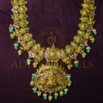 Elegant 22K (916) Temple Long Haram featuring ruby, emerald, and pearl detailing. Size: 16