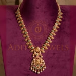 Elegant Pachiwork long necklace crafted in 916 (22kt) gold, adorned with Ruby (RU), Emerald (EM), Cubic Zirconia (CZ), and Pearl (PRL) stones. Finished with a bold black antique polish. Length: 18″ a stunning choice for timeless traditional style.