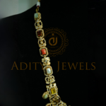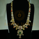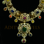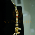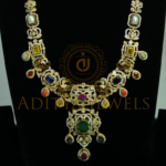 A classic Victorian long haram crafted in 22K (916) gold with CZ and colorful Navratan detailing. Length: 16