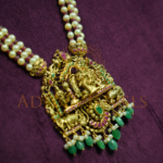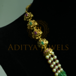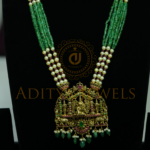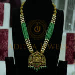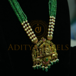 Elegant Temple Long Haram featuring 22K (916) gold craftsmanship enriched with ruby, emerald, pearl, and bead work. Length: 16