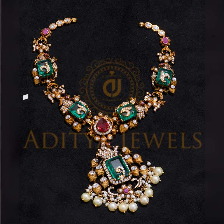 This beautifully designed 9″ short necklace is crafted in 22kt (916) gold, featuring CZ, light blue ruby (LBRU), light blue emerald (LBEM), and pearl accents. A unique blend of soft tones and classic design.