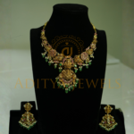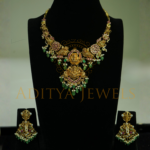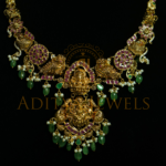 A traditional Nakshi Temple short neck design crafted in 22K (916) gold with ruby, emerald, pearl, and bead accents. Size: 9