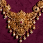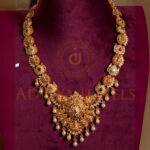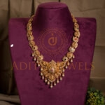 Gracefully crafted in 916 (22kt) gold, this Nakshi long necklace showcases vibrant Navratan stones, enhanced by a bold black antique finish. Length: 18″  a timeless piece that brings together heritage and elegance.