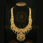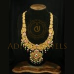 Fals Kundan Temple Jewellery crafted in 22K (916) gold, featuring red-green pota and maniya detailing with a classic black finish. Length: 16