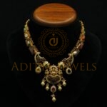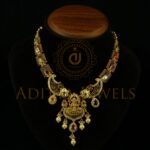 22K (916) Pachi Short Necklace with Navratan and pearl accents, gold finish, 9″ length. Gross wt: 31.29 g, Net wt: 27.058 g.