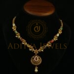 Exquisite Pachi Short Necklace in 22K (916) gold, featuring Navratan embellishments with pearl highlights and a rich gold finish. Length: 9″ (Gross wt: 22.24 g | Net wt: 19.508 g)