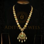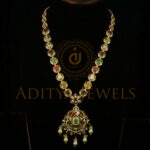 Exquisite Pachi Long Haram in 22K (916) gold, featuring Navratan embellishments and a timeless 16″ design.