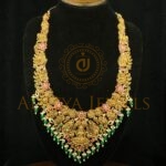 Exquisite Fals Kundan Temple Jewellery in 22K (916) gold, adorned with red and green pota, maniya accents, and a timeless black design. 16″ length.