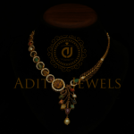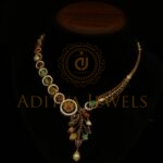 Pachi Short Necklace crafted in 22K (916) gold, adorned with Navratan stones and pearl detailing. Gross weight: 22.19 g, Net weight: 18.592 g, black finish. Length: 9