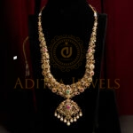 Crafted in 916 (22kt) gold, this exquisite Pachiwork long necklace is embellished with Ruby (RU), Emerald (EM), Cubic Zirconia (CZ), and Pearl (PRL) stones. Finished in a rich gold tone. Length: 18″  a perfect blend of elegance and tradition for any festive occasion.