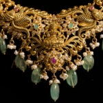 Elegant Nakshi short necklace crafted in 916 (22kt) gold, adorned with Ruby (RU), Emerald (EM), and Cubic Zirconia (CZ) stones. Finished with a rich black antique polish. Length: 9″ perfect for graceful, traditional styling.