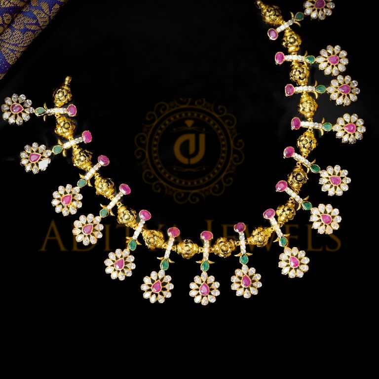 This 9-inch short necklace is made from 916 (22kt) gold and features elegant CZ, ruby (RU), and emerald (EM) stones.