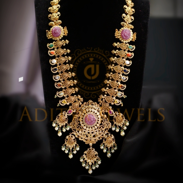 Expertly crafted in 916 (22kt) gold, this 9-inch short neck is embellished with CZ, Ruby, Emerald, and vibrant Navratan stones offering a rich, multicolored charm inspired by traditional heritage.