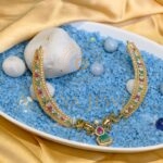 This 9-inch short necklace is crafted in 916 (22kt) gold and embellished with CZ, ruby (RU), emerald (EM), and pearl (Prl) stones.