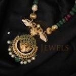 This 9-inch short necklace is crafted in 916 (22kt) gold and decorated with CZ, ruby (RU), emerald (EM), pearls (Prl), and beads.
