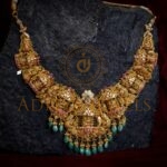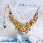 This 9-inch short necklace is made from 916 (22kt) gold and decorated with CZ, ruby (RU), emerald (EM), and beads.