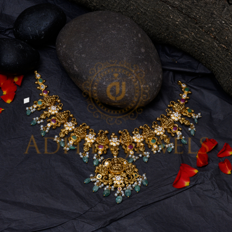 This exquisite 9″ short necklace is crafted in 22kt (916) gold, featuring a harmonious blend of CZ, emerald, pearls, and bead detailing. Designed with timeless elegance, it?s perfect for traditional and festive occasions.