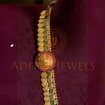 Traditional Nakshi long necklace handcrafted in 916 (22kt) gold, featuring Ruby (RU), Emerald (EM), and Cubic Zirconia (CZ) stones. Finished with a rich black antique polish. Length: 20″  perfect for a graceful and regal ethnic look.