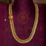 Traditional Nakshi long necklace handcrafted in 916 (22kt) gold, featuring Ruby (RU), Emerald (EM), and Cubic Zirconia (CZ) stones. Finished with a rich black antique polish. Length: 20″  perfect for a graceful and regal ethnic look.