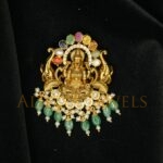 An exquisite temple-inspired pendant crafted in 22K (916) gold, adorned with Navratan stones, pearls, and emerald beads. Featuring elegant black detailing and a compact 2.5-inch design, it has a gross weight of 20.11 g and a net gold weight of 16.55 g—perfect for adding a traditional touch to any festive look.