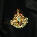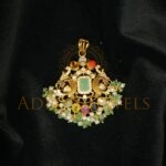 A beautifully designed Pachi-style pendant crafted in 22K (916) gold, embellished with Navratan stones, pearls, and emerald beads. Finished with classic black detailing, this 2.5-inch pendant features a gross weight of 11.28 g and a net gold weight of 8.712 g, making it a graceful choice for traditional and festive wear.
