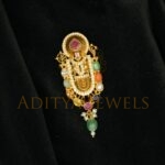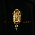 An elegant Pachi-style pendant crafted in 22K (916) gold, adorned with Navratan stones, pearls, and emerald beads. Finished with classic black detailing, this compact 2-inch pendant has a gross weight of 11.92 g and a net gold weight of 10.164 g, making it ideal for refined traditional and festive looks.